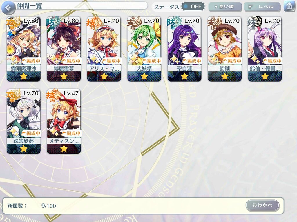 所持は支援・防御キャラが多くルナティックがキツくて手が出ません…