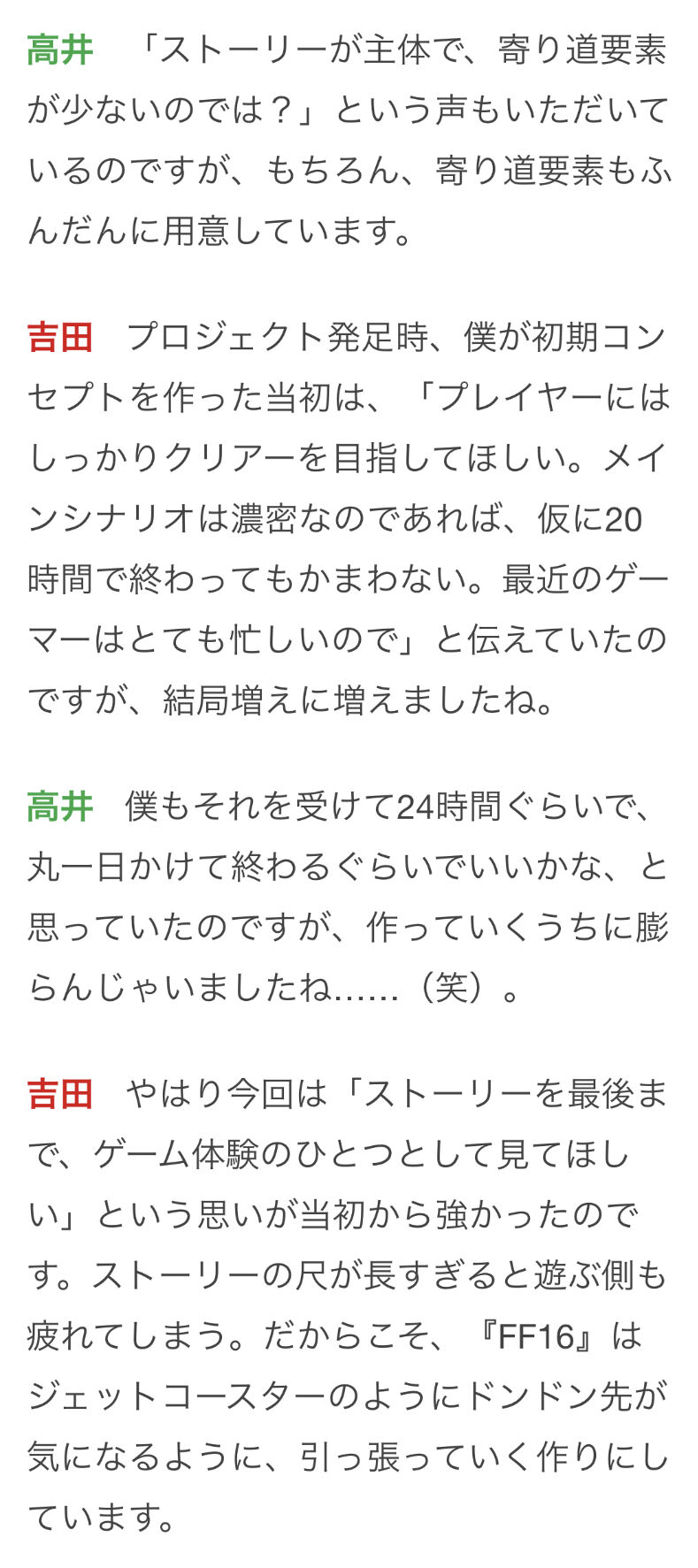 高井『FF16』はストーリードリブンのゲームで、シナリオをジェットコースターのように楽しんでもらうことになるのですが、クライヴの生き様をすべて見ようとすると、35時間前後はかかるかと思っています。