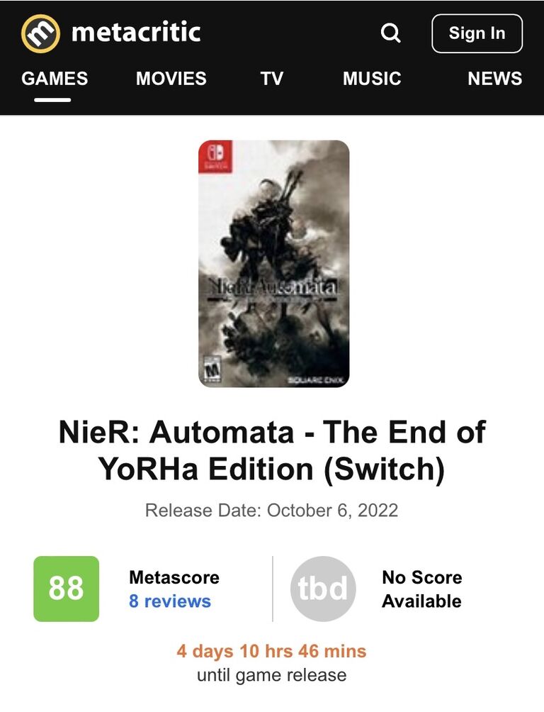 88 NieR: Automata (PS4) Mar 7, 2017https://www.metacritic.com/game/switch/nier-automata—the-end-of-yorha-edition