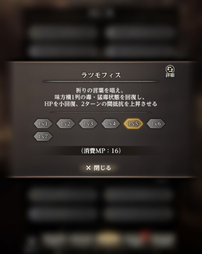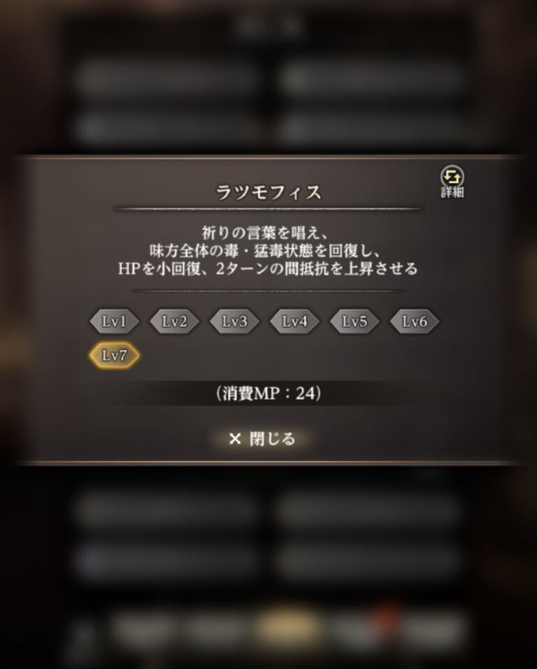 ラツモフィスはレベル7で全体HP回復、全体猛毒解除、全体抵抗アップになるんだ