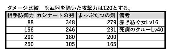 ただ自分の攻撃力が高いほど相手の防御力を無視していくから、ステータスを攻撃寄りにしてる俺の主人公なんかは殆ど全ての敵にカシナートの方が有効だから、今後よっぽど硬い敵が出ない限りはカシナートの方が強いかなって